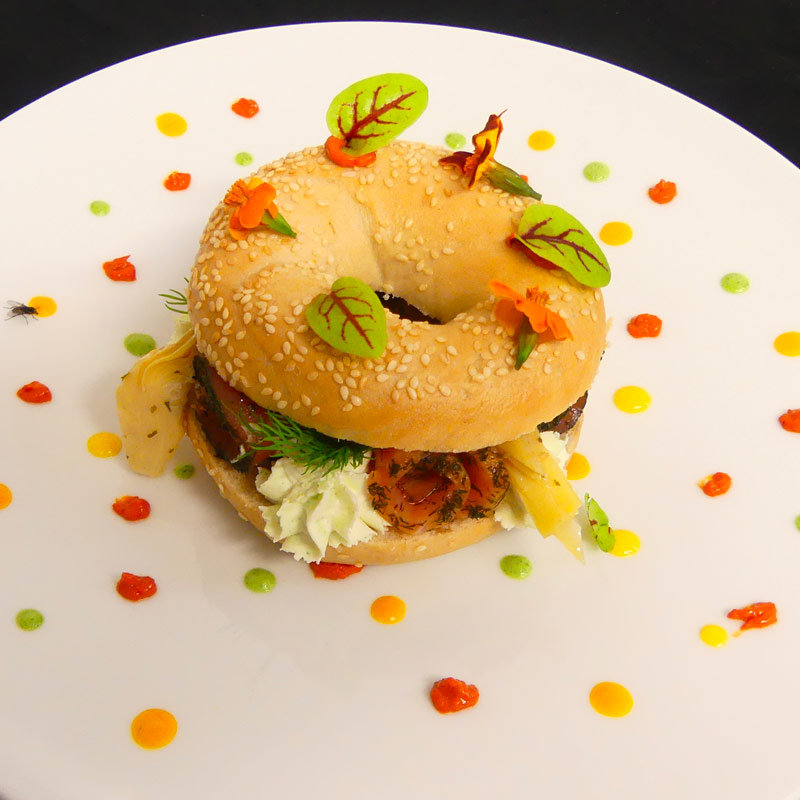 Entrée 1 – Bagel de notre Gravelax de saumon, guacamole, Crème d’herbes et confit de poivrons doux. – 7,50 €